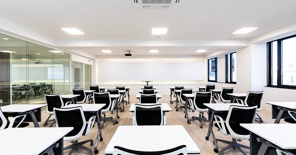 学校の特色の一つとして常に学生を中心に考えるという観点から、最新鋭の設備が整った、明るく開放的な教室を構築しました。教室と廊下の間の間仕切りを全面ガラスにすることによって、開放感のある上質で洗練された空間に仕上げています。また学校長のご意向で、他校にはない特注ガラス黒板やオフィス向きの回転チェア、デザイン性のある調光照明を採用。見た目の美しさはもちろんのこと、機能面での使い勝手の良さを兼ね備えた、新たな教育の創造の場を実現しました。