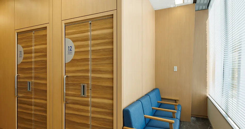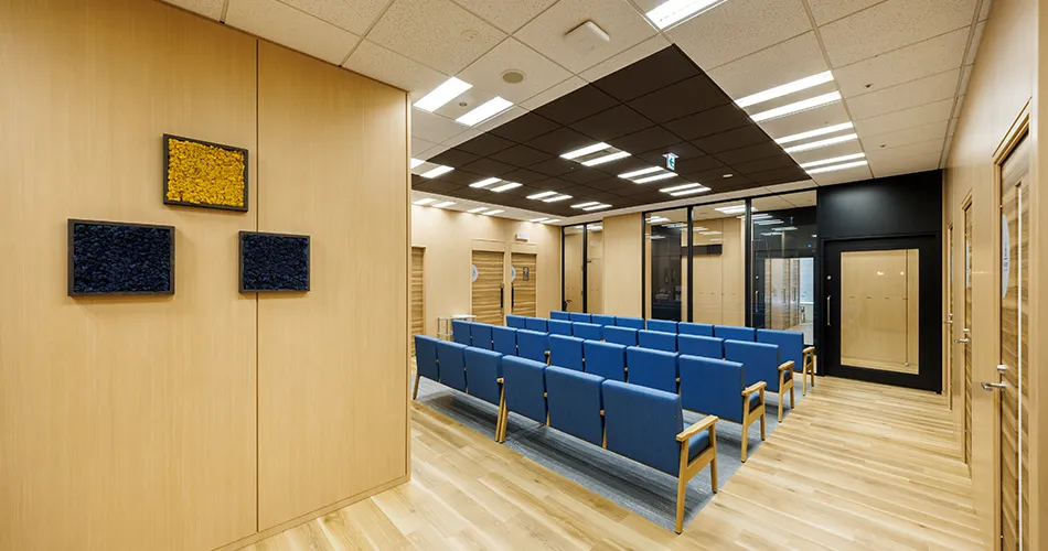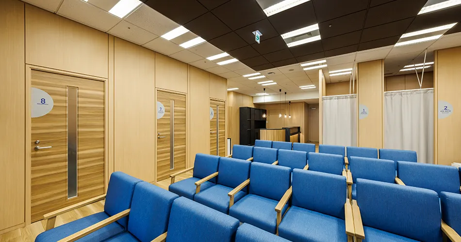 六本木の地域性もあり、検診を受ける方は多国籍。モジュールとピクトグラムを検証し、多様化に対応できる環境づくりを目指しました。改修前のイメージを払拭する為に、床と壁は明るく清潔感とリラックス効果のある、木目調素材を取り入れました。待合スペースは、落着ける空間を意識し、天井に深い色合いの塗装を施し、差別化をはかっています。壁の装飾はスカンディアモス(100%自然素材で作られた環境にも人にも優しい室内緑化)を取り入れ、人にやさしい室内環境と、ロゴマークと同色系でまとめた椅子など、全体が統一感に満ち、落ち着いた空間を設計しました。