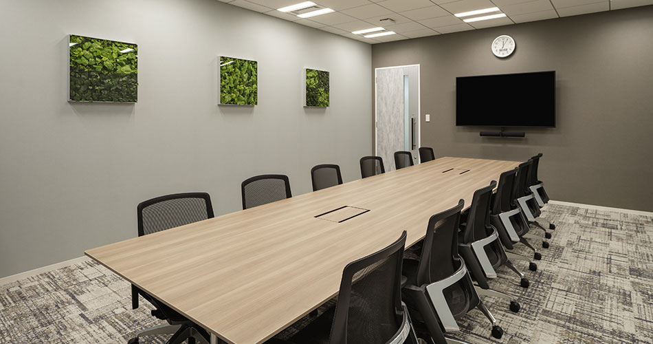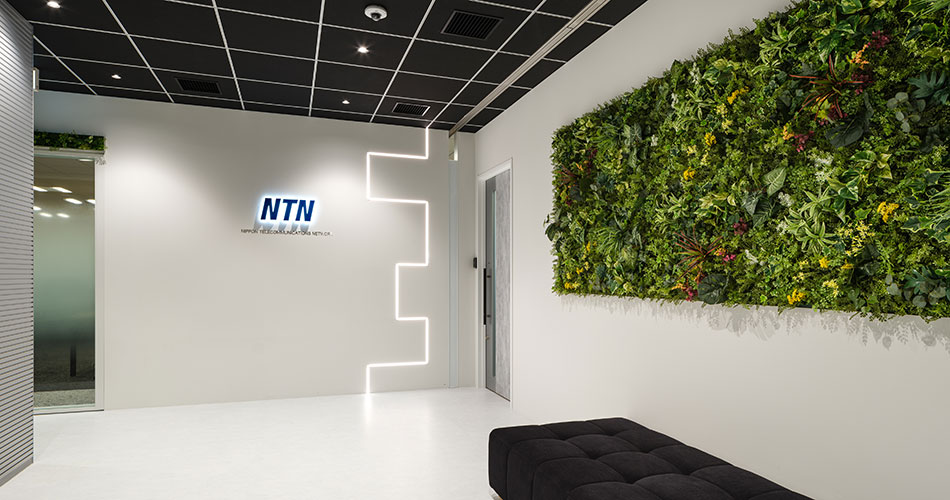 エントランスから会議室エリアは、IT企業にふさわしく先進性を感じられる空間を目指し、真っ白な空間の中に、ネットワークを「光」で表現。また、グリーンを配置することで先進性のなかにもリラックスさせる要素をつくり、訪れたお客様に印象深く残るようなエントランスとしました。
