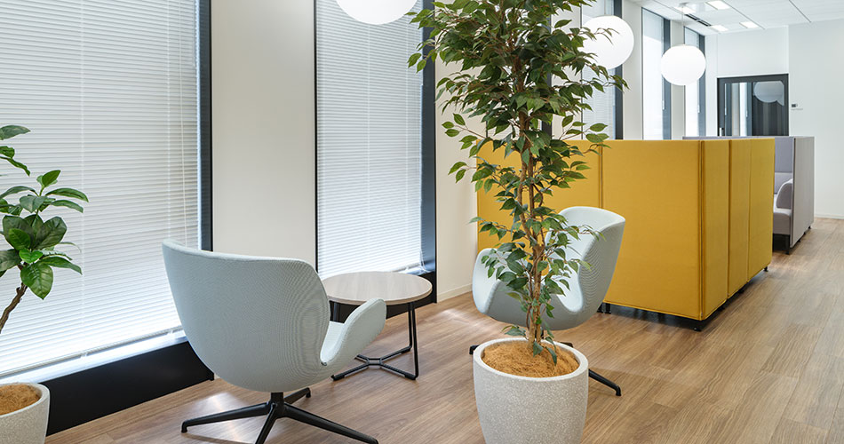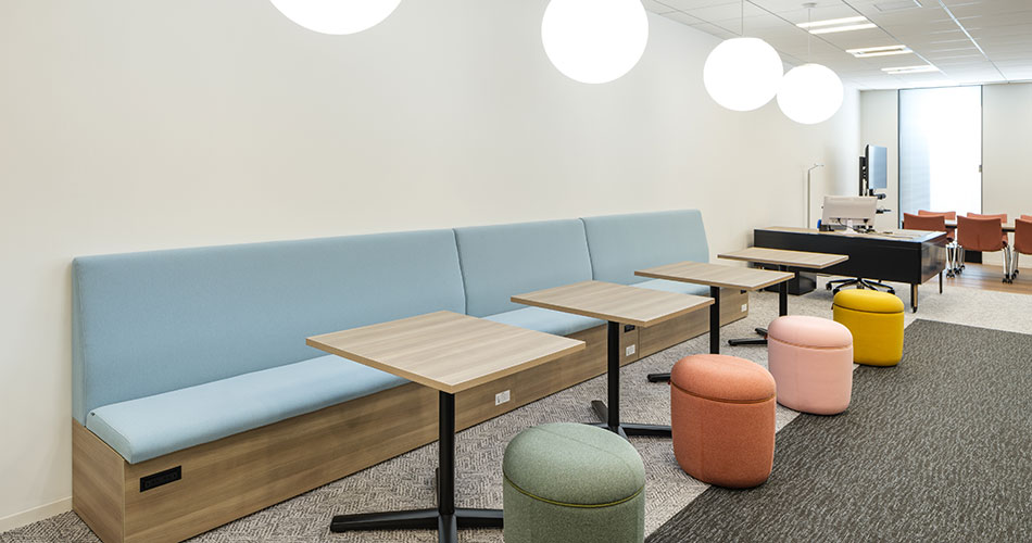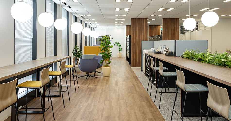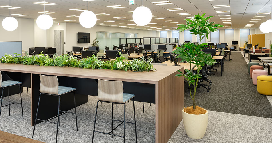 テレワークの導入をきっかけに2箇所に分かれていた本社機能を統合し、フリーアドレス・ABW環境を通してオフィスならではの価値を見出せる環境を実現しました。 -