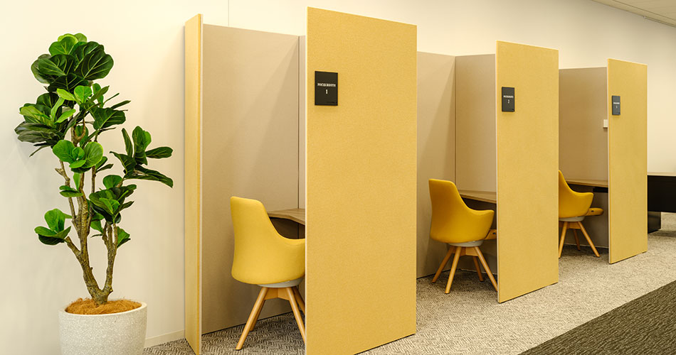 執務エリアはワーカーの働きやすさを考慮し、ABWを基本としたさまざまなワークエリア、フリーアドレス、上下昇降デスク、ファミレスシート、ハイカウンター席、ソファ席、個別ブース席等を配置。倉庫やサーバールームといった個室はビルのコア側にまとめ、フロア全体が見晴らしよく、開放感があるワークエリアとしました。