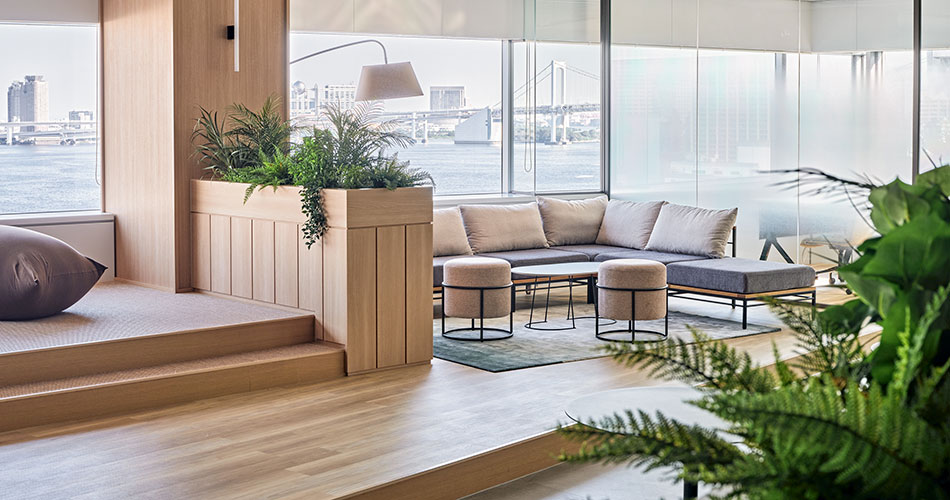 リモートワークが定着する中で、社内のコミュニケーションを見直すことをきっかけに拡大移転をしました。オフィスの中心に“横丁”を作ることで部署間の垣根を超えた交流が自然と発生し、各部署でつながりが生まれやすいオフィスとなりました。東京湾を一望できるラウンジ、リフレッシュスペースでは講演会や研修など様々なイベントも実施できるようになり、社内外のコミュニケーションを活性化して強固な企業文化を形成していくことを目指しています。