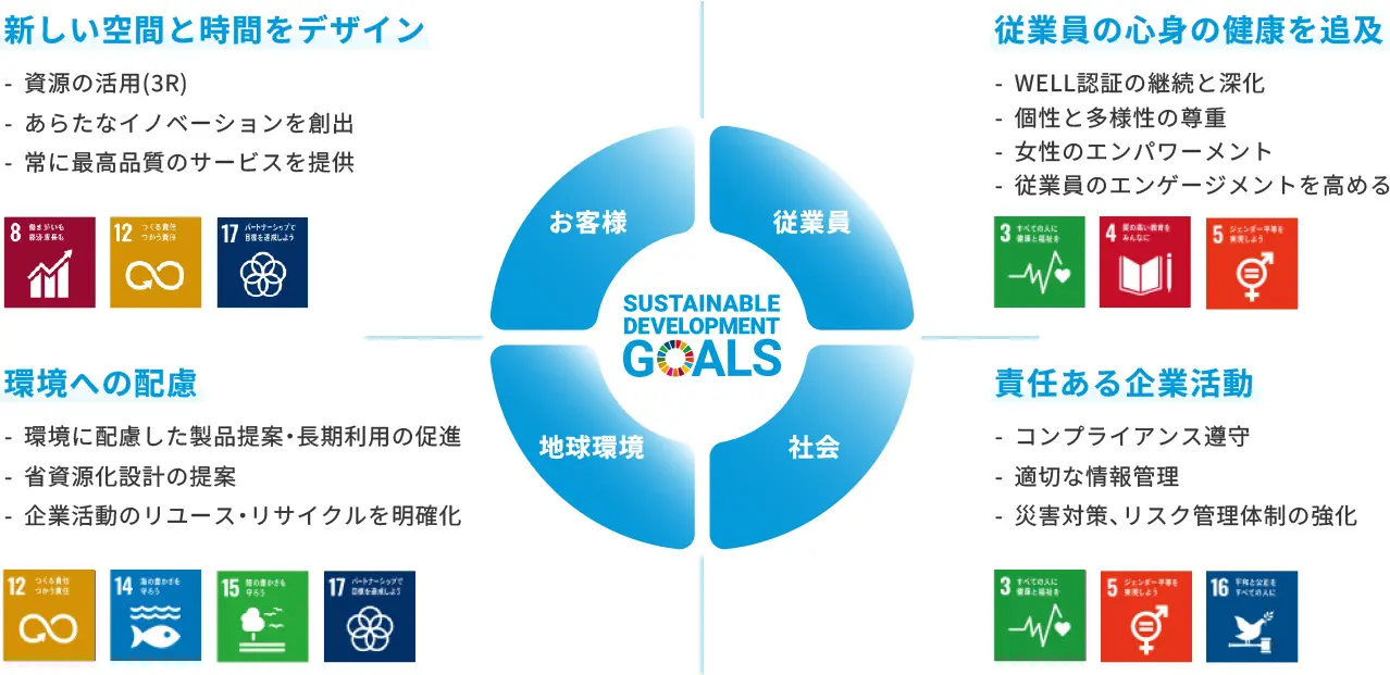 - 環境に配慮したオフィスの設計や働き方のコンサルティング、什器備品の調達、保守・点検、修理・修繕、クリーニングなどを通じて、省エネルギー・省資源に貢献します。