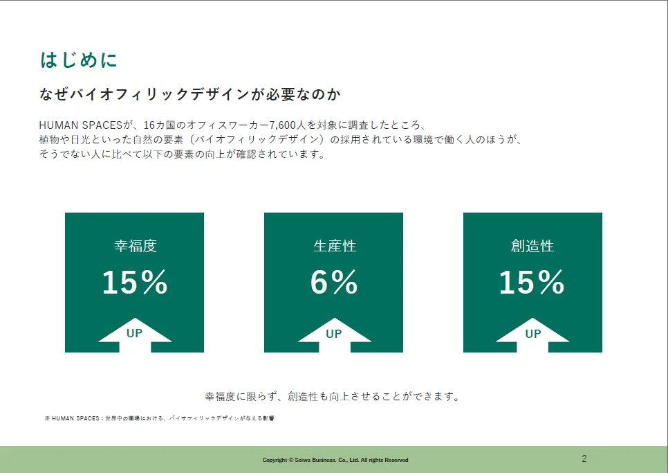 精神的、肉体的な幸福を向上させるための手段として効果があると証明されており、建物や空間内での認知機能も向上されます。