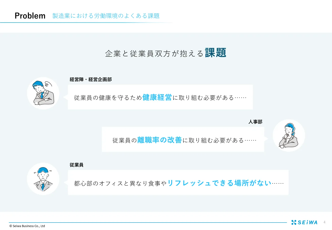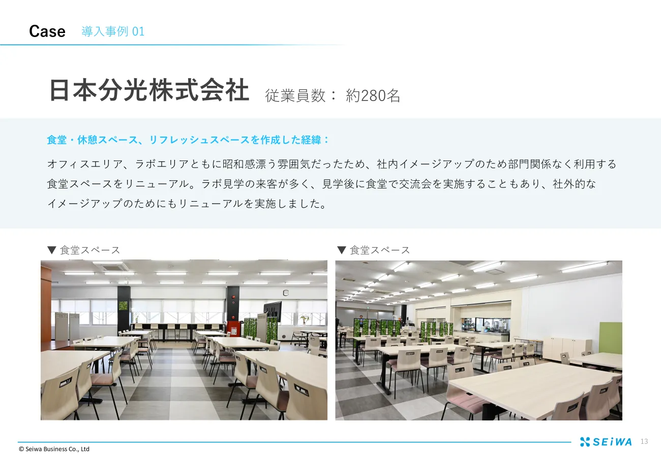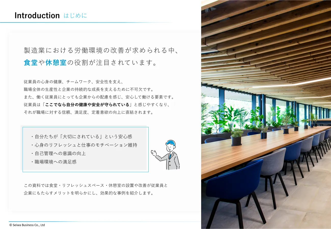 この資料では⾷堂・リフレッシュスペース・休憩室の設置や改善が従業員と企業にもたらすメリットを明らかにし、効果的な事例を紹介します。