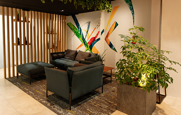 東京本社の7階エントランスは、都会の中でも自然との繋がりを向上させる、音・色・香りを用いたバイオフィリックデザインを取り入れました。