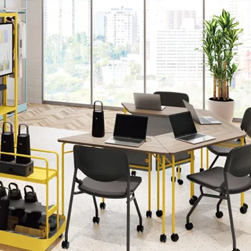 作業によって姿勢を変えたり、立ったり座ったりを繰り返す「スタンディングワーク」にも最適で、社員の健康と快適性に配慮したあたらしいオフィスのシンボルです。