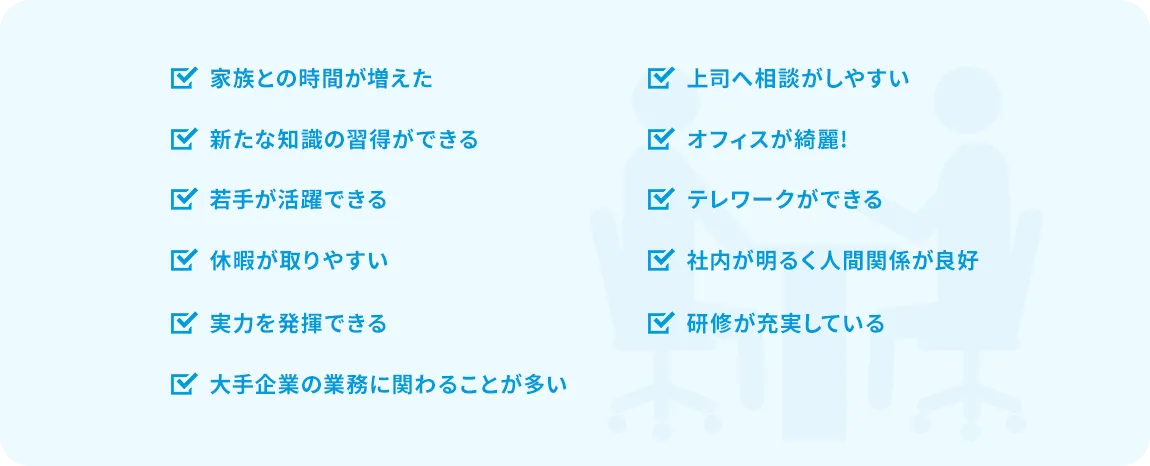 社員一人ひとりが、より生産的に、よりリラックスして働くことができるバックアップ体制が充実しているのも清和ビジネスの特長のひとつです。