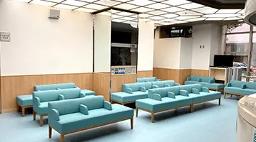 病室を入院患者がお見舞いにきた家族とリビングに居る感覚で過ごせるグリーン談話室に改修。