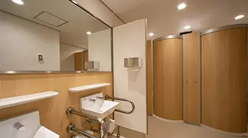 回転扉をを採用し、現在のトイレの面積のまま省スペースで車椅子の方でも利用できるトイレブースを設置しました。