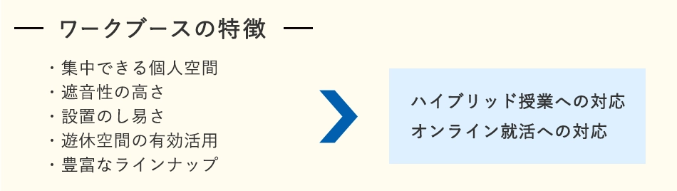 キャンパスにワークブースを導入することで、ハイブリッド授業への対応、就職活動の面談、自己PR動画の制作など、さまざまなシーンでスペースに悩む学生を支援することが可能となります。
